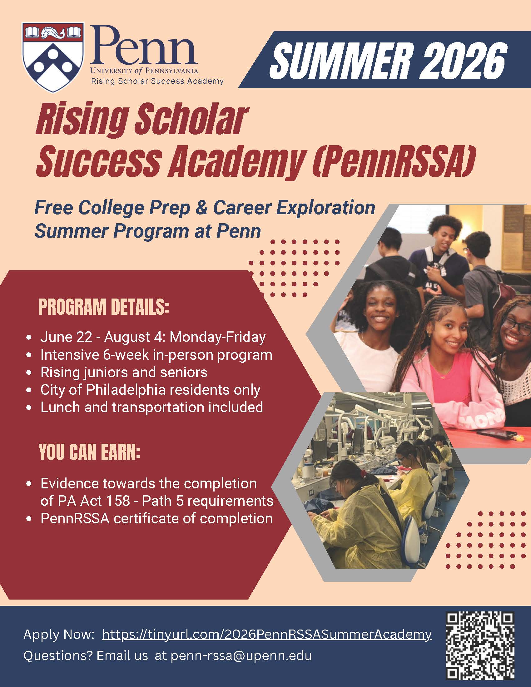 The Penn Rising Scholar Success Academy (PennRSSA) is a free, college preparatory and career exploration program designed for high school students across Philadelphia. Students enrolled in School District of Philadelphia, public charter, and Archdiocese of Philadelphia high schools are eligible to participate in either of our two programs regardless of their academic record.